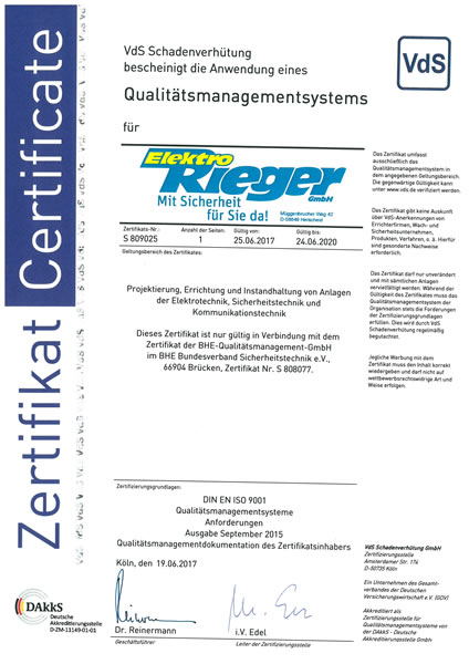 Seit 2009 sind wir zertifiziert nach DIN EN 2001:2008 und bieten umfangreiche Leistungen als Kompetenzpartner für Objekt- und Einbruchschutz, Brandschutz und vieles mehr. Des Weiteren sind wir qualifizierte Fachfirma gemäß DIN 14675 für Brandmeldeanlagen.